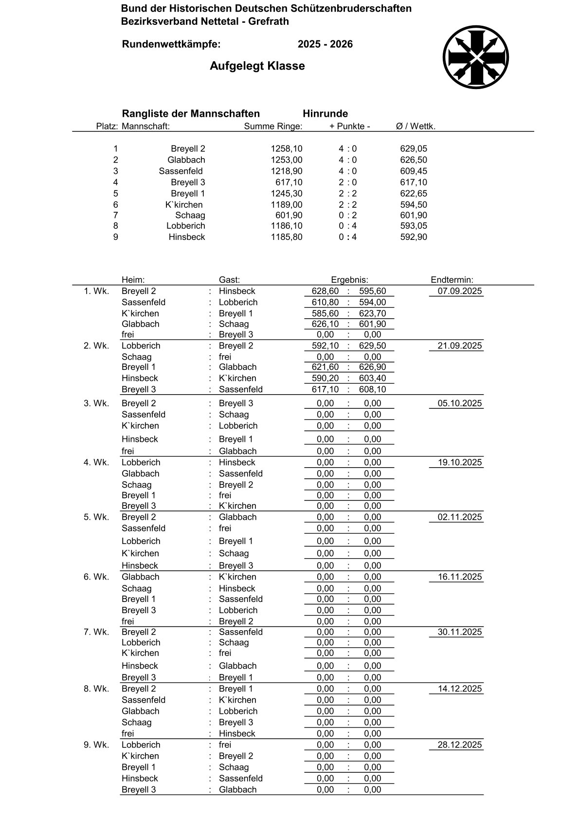 Es wird hier nicht unterschieden zwischen 1 .aufgelegt und 2. aufgelegt Klasse. Alle teilnehmenden Mannschaften schießen in einer Klasse die Hin- und Rückrunde gegeneinander.
